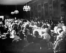 The date, time and place of the meeting was set in a Royal Proclamation of 18 September 1959, issued on the day that the previous Parliament was dissolved. The Duke of Buccleuch and Queensberry, who held the role of Lord Clerk Register, presided. When the Principal Clerk of Session George Macdonald read the roll of Peers of Scotland, 115 names were read, and 25 answered that they were present.[1] None of the Peers produced any proxies for those who were absent, but 28 Peers had submitted "Signed Lists" as a form of absent voting.[2] The Duke of Buccleuch himself chose not to vote; this was the "customary but not compulsory practice" of the Lord Clerk Register.[1]