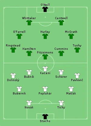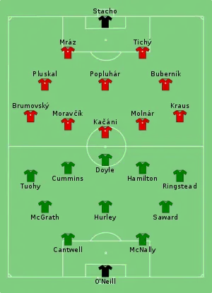 The first leg was played on 5 April 1959, and won by the Republic of Ireland 2–0. Czechoslovakia won the return leg 4–0 on 10 May 1959, and therefore Czechoslovakia won 4–2 on aggregate. As winners, Czechoslovakia entered the round of 16 with the fifteen nations that had received a bye.