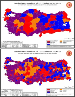 General elections were held in Turkey on 15 October 1961. The Republican People's Party (CHP) emerged as the largest party, winning 173 of the 450 seats.[1] It was the first time the CHP had won the most seats after the transition to a multi-party system, and the first time no party won a majority of seats. Voter turnout was 81%.