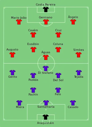 - ↑ Although Santamaría had amassed 20 caps for his native Uruguay from 1952 to 1957, he had been representing Spain in international play since 1958.[2]