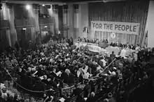 The Republican National Convention of 1964 was a tension-filled contest. Goldwater's conservatives were openly clashing with Rockefeller's moderates. Goldwater was regarded as the "conservatives' leading spokesman."[3] As a result, Goldwater was not as popular with the moderates and liberals of the Republican Party.[4][5] When Rockefeller attempted to deliver a speech, he was booed by the convention's conservative delegates, who regarded him as a member of the "eastern liberal establishment."