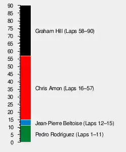 Lotus fate turned however during the race on Sunday, contested in searing heat.[1] Pedro Rodríguez took the lead at the start in his BRM, followed by Beltoise, Amon and Hulme. The Frenchman moved into the lead on lap 12, only to drop back four laps later with engine troubles. Amon was now back in the lead, followed closely by Rodriguez until the Mexican spun and crashed on lap 28. While he waited for his mechanics to pick up the car, spectators "descended on the car like vultures and stripped off the mirrors, seat, windscreen and nose cowling".[1] These retirements elevated Hill to second place behind Amon, who suffered a fuel pump failure on lap 58, handing Hill, who had been a mile behind,[1] first place and victory. Hulme was close behind Hill, but when his McLaren lost second gear, he needed to back off and the Englishman cruised home.[1][2] Beltoise recovered from his mechanical troubles and recorded the fastest lap of the race.