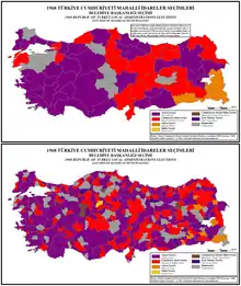 Local elections were held in Turkey on 2 June 1968. In the elections, both the mayors and the local parliaments (Turkish: İl Genel Meclisi) were elected. The figures presented below are the results of the local parliament elections.[1][2]