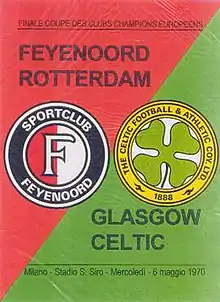 The 1970 European Cup final was a football match held at the San Siro, Milan, on 6 May 1970, that saw Feijenoord[lower-alpha 1] of the Netherlands defeat Celtic of Scotland 2–1 after extra time. Ove Kindvall's goal in the 117th minute meant the trophy was won by a Dutch club for the first time. It remains Feyenoord's only European Cup triumph.