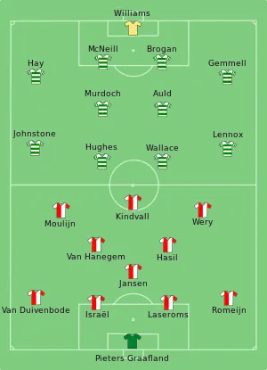 In contrast to their win in the European Cup final three years prior, in which they had gone into the match as heavy underdogs against Inter Milan, this time around, Celtic entered the final as strong favourites over Feyenoord. However, despite Celtic's Tommy Gemmell opening the scoring after 30 minutes, they were outplayed by the Dutch outfit, whose manager, Ernst Happel, ensured Celtic winger Jimmy Johnstone was double marked at all times, whilst the midfield trio of Franz Hasil, Willem van Hanegem, and Wim Jansen dominated their Scottish counterparts. Rinus Israël quickly equalised with his head; remarkably, this was the very first goal of Feyenoord's European campaign that they scored away from their home stadium.[lower-alpha 2] Early in the first half of extra time John Hughes intercepted a sloppy pass from Israel and burst past two Feynoord defenders and into the penalty area but he overan the ball slightly and could not quite clip the ball over the goalkeeper but then a Feynoord defender's passback to the goalkeeper almost resulted in an own goal. Highlights of a poor quality are on Youtube.In the second half, Celtic managed to hold on at 1–1 to force extra time.[2] With just a few minutes of extra-time remaining, a long free-kick from the Feyenoord half was sent towards the Celtic penalty area. Celtic defender and captain Billy McNeill stumbled and misjudged the ball, and as he tried to recover he appeared to punch the ball away. Before the referee had a chance to award a penalty, Ove Kindvall reacted quickly, running on and chipping the ball over the advancing goalkeeper Evan Williams to seal a 2–1 win for Feyenoord.[3][4]