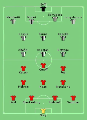 ![]() Ajax captain Johan Cruyff receives the trophy wearing a Juventus shirt, having exchanged jerseys with the losing finalists | |||||||