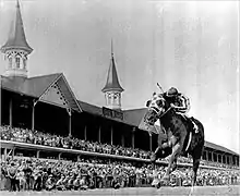 - ↑ The old record for the Derby was 2:00, set by Northern Dancer in 1964.[25][34] The previous fastest timed quarter mile record was 23+3⁄5 seconds by Whirlaway in 1941.[27]