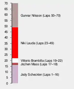David Purley stayed out later than most drivers and was running third by lap 21.[1] After he finally pitted, he emerged in front of race leader Lauda. He was likely unaware that Lauda was a lap ahead and did not let him through, holding the leader up for a few laps. This may have cost Lauda victory and the two were involved in an argument after the race.[2]