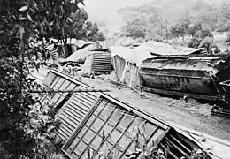 Despite having a relatively moderate magnitude, it generated unusually strong ground movements.[14] The city of Goleta suffered the greatest damage due to its location nearest to the epicenter. Items were thrown out off shelves at shops, glass windows on buildings shattered, walls cracked and one roof reportedly collapsed. Rockslides were triggered, one of them blocking California State Route 154, 5 km southeast of the San Marcos Pass, forcing a closure for 30 hours. Other landslides occurred nearby the San Marcos Pass, and along south of U.S. Highway 101.[15] The airport terminal at the Santa Barbara Municipal Airport leaned, and a nearby freight train from Goleta derailed.[6] At the library of the UCSB, some 400,000 volumes or about one third of all books were thrown out of shelves. The total damage was at $15 million, in the UCSB it was at $5.5 million alone.[11][6]