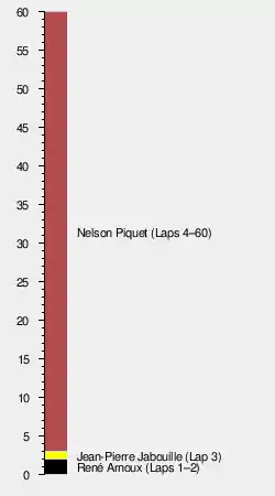 The front row of the grid was occupied by the Renaults of René Arnoux and Jean-Pierre Jabouille, although Piquet led by lap 4 and was never headed. On lap 6, Villeneuve crashed his Ferrari heavily at the corner which now bears his name, following a puncture. Villeneuve escaped unhurt, but the incident also caused the retirement of Bruno Giacomelli, who ran over some of the debris in his Alfa Romeo. Jones moved up to second on lap 29 after running as low as seventh. Behind Reutemann, Elio de Angelis finished fourth in his Lotus, with Keke Rosberg fifth in his Fittipaldi and Didier Pironi sixth in his Ligier.