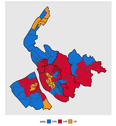 ![]() Map of Merseyside County Council showing wards won by party[2] | |||||||||||||||||||||||||||||||||||||
