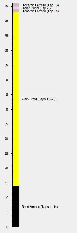 René Arnoux took pole position in his Renault and led until he spun off at the Swimming Pool on lap 15. Team-mate Alain Prost took over the lead and held it until the closing stages, when rain started to fall. On lap 74, three from the end, Prost pushed too hard and crashed into the Armco barriers coming out of the Chicane du Port (also known as the Dog Leg), handing the lead to Riccardo Patrese in the Brabham. Then, on lap 75, Patrese spun on oil at the Loews hairpin and stalled.