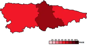 The Spanish Socialist Workers' Party (PSOE) scored a landslide victory by securing a comfortable absolute majority of 26 out of 45 seats, with 52% of the vote. The People's Coalition, headed by the conservative People's Alliance and joined by the People's Democratic Party (PDP) and the Liberal Union (UL) became the second political force and the main opposition party in the General Junta with 14 seats and 30.2%. The Communist Party of Spain (PCE) obtained 5 seats and 11.1%, whereas the Democratic and Social Centre (CDS) was left as an extra-parliamentary party after failing to reach the 5% regional threshold.[1] The former ruling party of Spain, the Union of the Democratic Centre (UCD), had chosen to dissolve itself in February 1983 and did not contest the election as a result.[2]