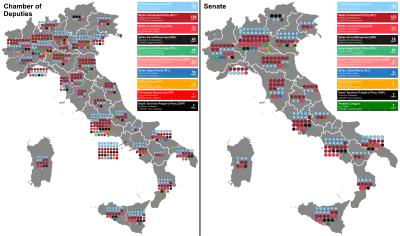For the Senate, 237 single-seat constituencies were established, even if the assembly had risen to 315 members. The candidates needed a landslide victory of two thirds of votes to be elected, a goal which could be reached only by the German minorities in South Tirol. All remained votes and seats were grouped in party lists and regional constituencies, where a D'Hondt method was used: inside the lists, candidates with the best percentages were elected.