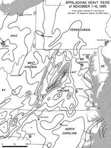 The system dropped rainfall from North Carolina to Pennsylvania, westward to Ohio,[7] with a peak of 19.77 in (502 mm) just northeast of Montebello, Virginia.[5] Widespread areas reported over 10 in (250 mm) of precipitation, with an unofficial total of about 14 in (360 mm) in West Virginia.[1] Flash flooding occurred in mountainous portions of Virginia, West Virginia, and Pennsylvania,[7] after orographic lift caused particularly high rainfall totals in the southern Appalachian Mountains.[6] A total of 63 gauging stations along rivers and streams recorded flood magnitudes greater than the 100-year event,[nb 2] of which 40 surpassed the previous record by more than 50%.[1] In addition to the floods, the storm produced the highest tidal flooding in the Chesapeake Bay and its tributaries since the 1933 Chesapeake–Potomac hurricane, and in some cases surpassed that of Hurricane Hazel in 1954. This was due to persistent southeasterly winds just days after a full moon, causing tides that reached 4 to 5 ft (1.2 to 1.5 m) above normal in many places in Maryland, with 6 to 8 ft (1.8 to 2.4 m) waves on top.[7] Overall damage totaled $1.4 billion, and the system killed 62 people; if the system were a tropical cyclone, it would have ranked as the fourth costliest United States hurricane at the time.[1]
