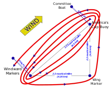 The Fremantle Fairway Buoy 31°57′9.0″S 115°38′48.12″E / 31.952500°S 115.6467000°E[19] was renamed the "America's Cup Buoy" for the duration of the event and marked one end of the start and finish lines for each America's Cup race.[8] The buoy is a permanent navigation marker used for shipping in and out of Fremantle harbour and is located 8 nautical miles (15 km) west-north-west of the harbour, in Gage Roads[20] or 5.5 nautical miles (10.2 km) due west of City Beach. Races in the challenge and defence elimination trials used other markers in the general vicinity.
