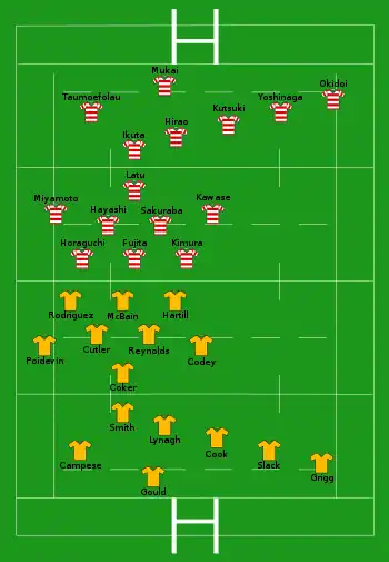 | Try: Taumoefolau (2) Yoshinaga Pen: Yoshinaga Kutsuki | Try: Nelson Purcell Lambert Con: Nelson (3) Pen: Nelson |