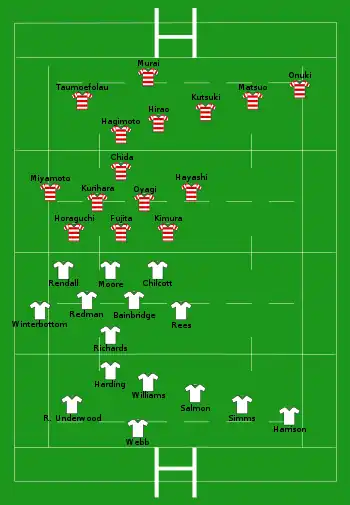 | Try: Harrison (3) Underwood (2) Salmon Richards Redman Rees Simms Con: Webb (7) Pen: Webb (2) | Try: Miyamoto Pen: Matsuo |
