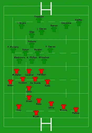 | Pen: Rees (3) | Try: Evans (4) Devereux Bowen Hadley Phillips Con: Thorburn (4) |