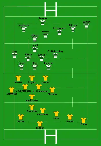 | Try: Murariu (2) Toader Con: Alexandru Ion Pen: Alexandru (3) Ion | Try: Jeffrey (3) Tait (2) Hastings (2) Duncan Tukalo Con: Hastings (8) Pen: Hastings |