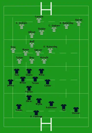 | Try: Tait (2) Tukalo (2) Duncan (2) Paxton (2) Oliver Hastings Jeffrey Con: Hastings (8) | Try: Buitendag Con: Grobler Pen: Grobler (5) |