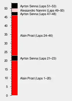- ↑ Ayrton Senna set the fastest lap of 1:43.025 on lap 38, but this was annulled due to his disqualification.