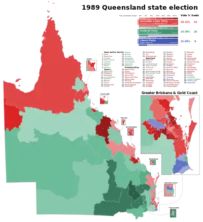 - ↑ Australian Government and Politics Database. "Parliament of Queensland, Assembly election, 2 December 1989". Archived from the original on 18 January 2015. Retrieved 22 February 2009.