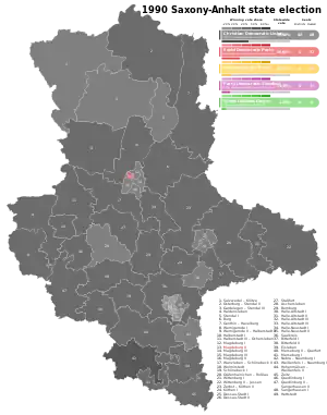 The 1990 Saxony-Anhalt state election was held on 14 October 1990 to elect the members of the first Landtag of Saxony-Anhalt. It was the first election held in Saxony-Anhalt since the reunification of Germany, which took place on 3 October. The Christian Democratic Union (CDU) led by Gerd Gies emerged as the largest party with 39.0%, followed by the Social Democratic Party (SPD) with 26.0%. The CDU formed a coalition with the Free Democratic Party (FDP), and Gies became Saxony-Anhalt's first post-reunification Minister-President.