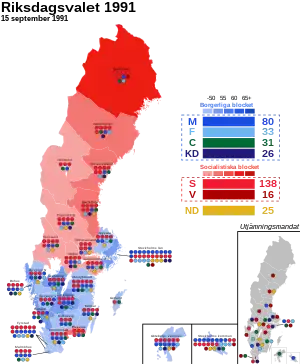 General elections were held in Sweden on 15 September 1991.[1] The Swedish Social Democratic Party remained the largest party in the Riksdag, winning 138 of the 349 seats.[2] However, it was the party's worst showing since 1928 with 37.7% of the vote.[3]