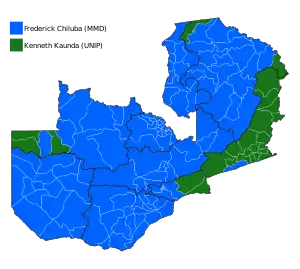 General elections were held in Zambia on 31 October 1991 to elect a President and National Assembly. They were the first multi-party elections since 1968, and only the second multi-party elections since independence in 1964. The United National Independence Party (UNIP), which had led the country since independence (from 1973 to 1990 as the sole legal party), was comprehensively beaten by the Movement for Multi-Party Democracy (MMD). Kenneth Kaunda, who had been president since independence, was defeated in a landslide by MMD challenger Frederick Chiluba in the presidential elections, whilst the MMD won 125 of the 150 elected seats in the expanded National Assembly. Voter turnout was 45%.[1]