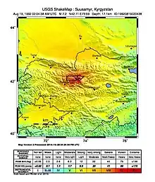 The 1992 Suusamyr earthquake occurred at 02:04 UTC on 19 August near Toluk in the border area of Kyrgyzstan. The shock had a surface wave magnitude of 7.5 and a maximum felt intensity of IX (Violent) on the Mercalli intensity scale. It was a result of reverse faulting.[2] The death toll from the event amounted to about 75, including 14 people who were killed by landslides.
