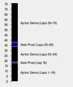 Senna's drive to victory is regarded as one of his finest,[3] and his first lap exploits are particularly lauded, in which he passed four drivers – Michael Schumacher, Karl Wendlinger, Damon Hill and Alain Prost – to take the lead in a single lap in damp conditions.[4][5] The race was the first held under the European Grand Prix title since 1985, and to date is the only Formula One Grand Prix to have been held at the Donington Park circuit.[6]