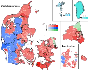General elections were held in Denmark on 21 September 1994.[1] The coalition of the Social Democratic Party, the Danish Social Liberal Party and the Centre Democrats led by Poul Nyrup Rasmussen remained in power despite the Christian People's Party, which had been part of the government, failing to cross the 2% threshold and losing all four seats. Voter turnout was 84.3% in Denmark proper, 62.3% in the Faroe Islands and 56.7% in Greenland.[2]