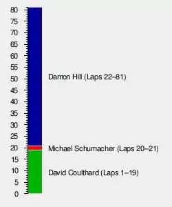 After the first round of pitstops, Schumacher and Alesi collided, with both retiring.[6] Schumacher's Benetton team-mate, Johnny Herbert took second place briefly before coming in for his first stop later than many of the other drivers, while surviving a potential accident in which he missed the pit entry and rejoined the track.[6] Berger was promoted to second, but his Ferrari encountered an engine problem, forcing him to retire. This promoted Frentzen to second, but he too retired due to a gearbox problem. With many of the front-runners out, Hill led at the front, even with a 22-second botched pit stop, with Herbert second. Jordan driver Eddie Irvine rounded out the top three, before retiring after losing all of his pneumatic pressure.[6] Herbert was still second, and looked set as a result to claim third place in the Drivers' Championship.[12] However, he was forced out of the race as his Benetton suffered a driveshaft failure.[6] Olivier Panis was now second in his Ligier a lap behind Hill, with Footwork driver Gianni Morbidelli third, two laps down. With a few laps remaining, Panis' Ligier was suffering an oil leak, and Hill lapped him for a second time on his way to victory.[6] Panis remained second, with Morbidelli third for his only career podium, and the first podium for the Footwork/Arrows team in six years.[6] Behind the top three, Mark Blundell was fourth in the sole McLaren, with Mika Salo fifth in the Tyrrell. Pedro Lamy had a mid-race spin, but recovered to take sixth in his Minardi – his only Formula One point, and Minardi's last until the 1999 European Grand Prix.[6] Only eight cars finished the race, with Pedro Diniz seventh place being Forti's best Formula One finish.[6] The eighth place for Pacific also equalled their best result since the 1995 German Grand Prix. The race was televised by Channel 9 in Australia and by the BBC in the UK.