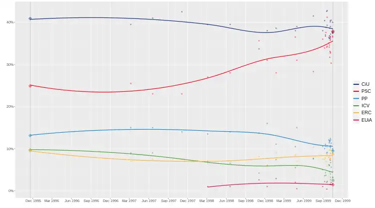 - ↑ "Un sondeo da 55 escaños a CiU y 45 al PSC". La Vanguardia (in Spanish). 28 July 1999.