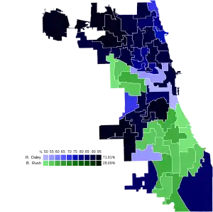 Daley won a majority of the vote in 33 of the city's 50 wards.[7] Rush won a majority of the vote in the remaining 17 wards.[7]