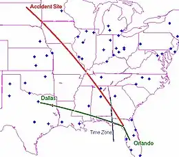 - Note: all times are presented in 24-hour format. Because the flight took place in both the Eastern Time zone – Eastern Daylight Time (EDT) – and the Central Time zone – Central Daylight Time (CDT) – all times are given in this article in Coordinated Universal Time (which is indicated by the time followed by the letters UTC).