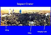 Impact occurred approximately 17:13 UTC, or 12:13 local, after a total flight time of 3 hours, 54 minutes, with the aircraft hitting the ground at nearly supersonic speed and at an extreme angle.[12] The Learjet crashed in South Dakota, just outside Mina in Edmunds County, on relatively flat ground and left a crater 42 feet (13 m) long, 21 feet (6.4 m) wide, and 8 feet (2.4 m) deep. None of its components remained intact.[2]