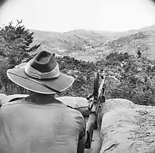 On the night of 13–14 September the battalion captured its first prisoner as it continued to conduct patrolling operations.[2] By the end of the month 1 RAR was relieved and whilst one company was detached to 1st Battalion, Welsh Regiment to occupy the Yong Dong hill feature the rest of the battalion was placed into the brigade reserve.[3] This lasted until November when as part of Operation Nescala, 1RAR relieved the 1st Battalion, Royal Canadian Regiment on Hill 355.[3] The position had been poorly maintained and over the course of the next ten days 1 RAR had to regain control of the approaches and re-establish security in the area, suffering 50 casualties in the process.[2] At the same time, the battalion also supported the Royal Fusiliers in Operation Beat Up by launching a diversionary attack on Hill 227 on 25–26 November 1952.[2]
