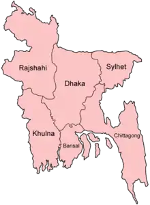 Throughout the decade Bangladesh was administratively divided into 6 divisions, namely Dhaka, Chittagong, Khulna, Rajshahi, Barisal and Sylhet which were further subdivided into a total of 64 districts (See List of districts of Bangladesh).