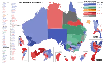 Another major issue was the collapse of the country's second-biggest airline Ansett Australia and the question of whether it should be given a bailout. The Coalition was opposed to any bailout because the collapse was not the government's fault. However, Labor supported a bailout, because the company's collapse was about to result in the biggest mass job loss in Australian history, whilst also arguing that the government was partially responsible for allowing Ansett to be taken over by Air New Zealand, a move which had caused Ansett's failure.[2] Although the two-party preferred result was reasonably close, the ALP recorded its lowest primary vote since 1934.[3]