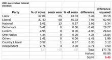 The disproportionality of the lower house in the 2001 election was 9.43 according to the Gallagher Index, mainly between the Coalition and Labor Parties.