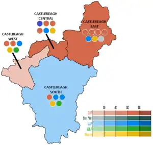 | Castlereagh West | 29.4 | 2 | 25.3 | 1 | 16.6 | 1 | 17.5 | 1 | 4.4 | 0 | 6.8 | 0 | 5 |