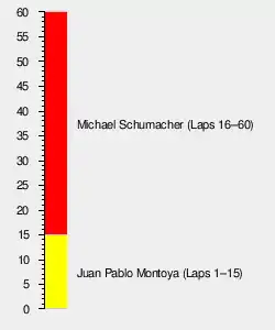 Michael Schumacher and the Williams drivers all pitted on lap 13, but Ralf's stop went wrong as the Williams crew did not have his tyres ready.[4] Coulthard briefly inherited the lead, but the McLaren team had gambled by leaving him out longer than the other leaders, bringing him in on lap 15.[3] On lap 16, Michael Schumacher passed Montoya for the lead, and on lap 19 Barrichello completed his charge by passing the Colombian for second.
