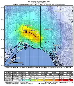 The 2002 Denali earthquake occurred at 22:12:41 UTC (1:12 PM Local Time) November 3 with an epicenter 66 km ESE of Denali National Park, Alaska, United States. This 7.9 Mw earthquake was the largest recorded in the United States in 37 years (after the 1965 Rat Islands earthquake). The shock was the strongest ever recorded in the interior of Alaska.[5] Due to the remote location, there were no fatalities and only one injury.