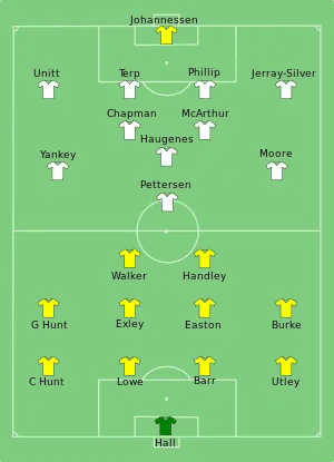 Doncaster Belles lined up in a traditional 4–4–2 formation. Walker overcame a neck injury[25] to start alongside Handley in attack, with Melanie Garside—who scored the winner in the 2000 semi-final—left on the substitutes' bench alongside veteran Gail Borman.[19] The Hunt twins, signed earlier in the season from Charlton Athletic, were both selected; having brought "grit, commitment and shape" to a previously disorganised team.[19] Experienced defender Mandy Lowe was given a marking job on Pettersen.[19] Fulham fielded a 4–3–3 formation, with Rachel Yankey and Kristy Moore flanking Pettersen in attack. Both teams wore their home kits; Doncaster Belles in yellow and blue, while Fulham lined up in white and black.[23]