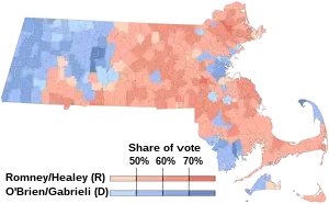 Romney performed strongly with Republicans and won many independents in the belt between Route 128 and I-495. He almost ran even with O'Brien in smaller working-class cities, and held down Democratic margins in large urban areas.[2][4] This was the fourth consecutive win for Republicans in the state gubernatorial contest.[8]