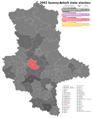 The 2002 Saxony-Anhalt state election was held on 21 April 2002 to elect the members of the 4th Landtag of Saxony-Anhalt. The incumbent Social Democratic Party (SPD) minority government led by Minister-President Reinhard Höppner was defeated. The SPD fell to third place, while the Christian Democratic Union (CDU) moved into first. The CDU subsequently formed a coalition with the Free Democratic Party (FDP), and CDU leader Wolfgang Böhmer was elected Minister-President.