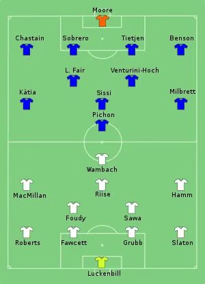 On 12 minutes Marinette Pichon scored with WUSA North's first chance, turning and hitting a powerful 15-yard shot into the goal. Nine minutes later Hege Riise equalized from Mia Hamm's pass, and thereafter the WUSA South team took control of the match. Abby Wambach shot past goalkeeper Melissa Moore to score her first goal on 24 minutes. One minute before half-time Kylie Bivens headed in Hamm's cross to give WUSA South a two-goal advantage at the interval.[9]