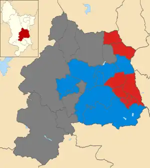 Map of the results of the 2004 Amber Valley council election. Conservatives in blue and Labour in red. Wards in grey were not contested in 2004.